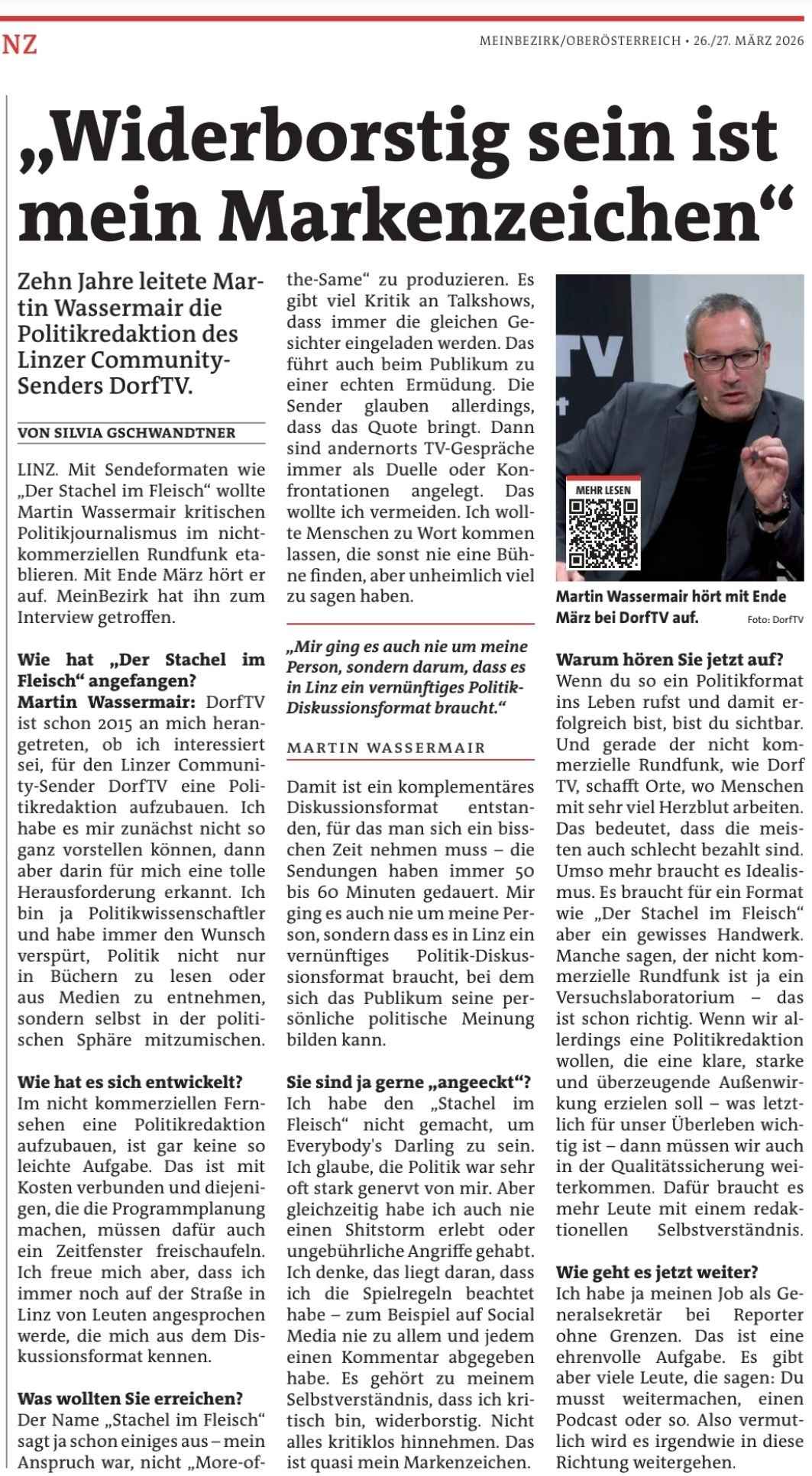Ende März 2026 habe ich meine Tätigkeit bei DORFTV als leitender Politikredakteur beendet und zugleich vom nichtkommerziellen Rundfunk Abschied genommen. Aus diesem Anlass hat mich MeinBezirk Linz um ein Interview gebeten.