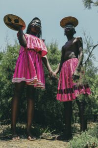 Namafu Amutse lebt und arbeitet in Windhoek. Die Hauptstadt Namibias ist bis heute von den Spuren der genozidalen Gewalt des deutschen Kaiserreichs und dem Befreiungskampf gegen das von 1960 bis 1989 währende südafrikanische Apartheidregime geprägt. Die Auseinandersetzung mit dieser Vergangenheit verlangt nach einem Bruch in den Erzählweisen des Visuellen – insbesondere, wenn es um die Symboliken der Unterdrückung geht. Amutse präsentiert in ihren Arbeiten eine afrofuturistische Fotografie, die sich durch eine unverwechselbare Handschrift und eine eigenständige Bildsprache auszeichnet. Sie ist in den Bereichen Film, Fotografie und Publizistik tätig und widmet sich vorrangig der Darstellung Schwarzer Körper, die in afrikanische Stoffe gehüllt sind und durch extravagante Brillen, Masken und „Doeks“ (Kopftücher) akzentuiert werden. Häufig portraitiert die Künstlerin Frauen, Kinder und fluid-geschlechtliche Personen, die sie vor sorgfältig ausgewäh